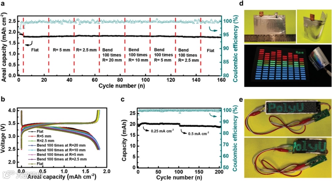 图5. 基于预锂化碳布负极的软包柔性电池性能。a. 软包柔性电池性能。b.不同弯曲状态下柔性电池充放电曲线。c. 软包电池长循环性能。d. 软包柔性电池的外观和弯曲状态下点亮LED面板照片。e. 柔性电池在平直和弯曲状态下点亮柔性LED灯带。