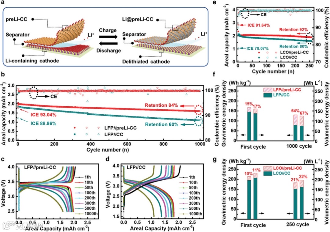 图4. 基于原始碳布和预锂化碳布负极的全电池性能。a. 基于预锂化碳布负极的全电池示意图。b. 匹配LiFePO4正极的全电池性能。c. 预锂化碳布负极全电池的充放电曲线。d.原始碳布负极全电池的充放电曲线。e.匹配LiCoO2正极的全电池性能。f. LFP全电池使用原始碳布负极和预锂化碳布负极的能量密度对比。g. LCO全电池使用原始碳布负极和预锂化碳布负极的能量密度对比。