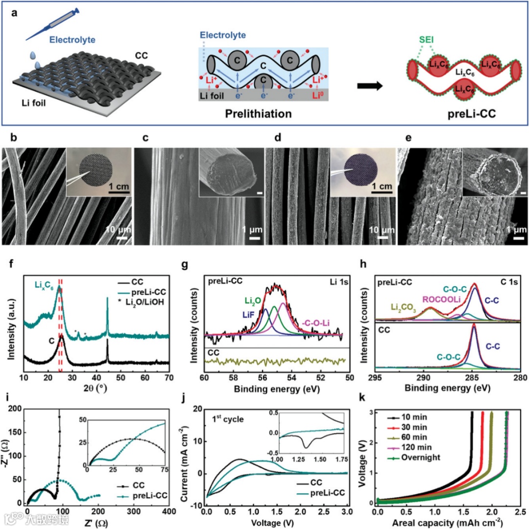 图2. 预锂化碳布负极的制备示意图及表征。a. 直接接触预锂化制备预锂化碳布负极示意图。b-c. 原始碳布形貌。d-e. 预锂化碳布形貌图。f. 原始碳布和预锂化碳布的XRD图谱。g-h. 原始碳布和预锂化碳布Li 1s 和C 1s XPS图谱。i-j. 原始碳布和预锂化碳布的EIS和CV曲线。k. 预锂化处理时间对嵌入锂离子容量的影响。