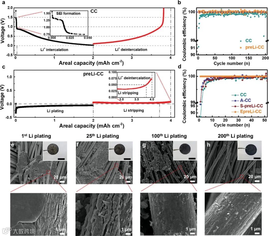 图3. 原始碳布和预锂化碳布负极的电化学性能和行为。a. 原始碳布负极的充放电曲线。b. 原始碳布和预锂化碳布的库伦效率对比。c. 预锂化碳布负极的充放电曲线。d. 原始碳布,电活化碳布,脱嵌后的预锂化碳布和电化学预锂化碳布负极四种样品的库伦效率。e-h. 预锂化碳布负极表面第1次,第25次,第100次和第200次锂金属沉积。
