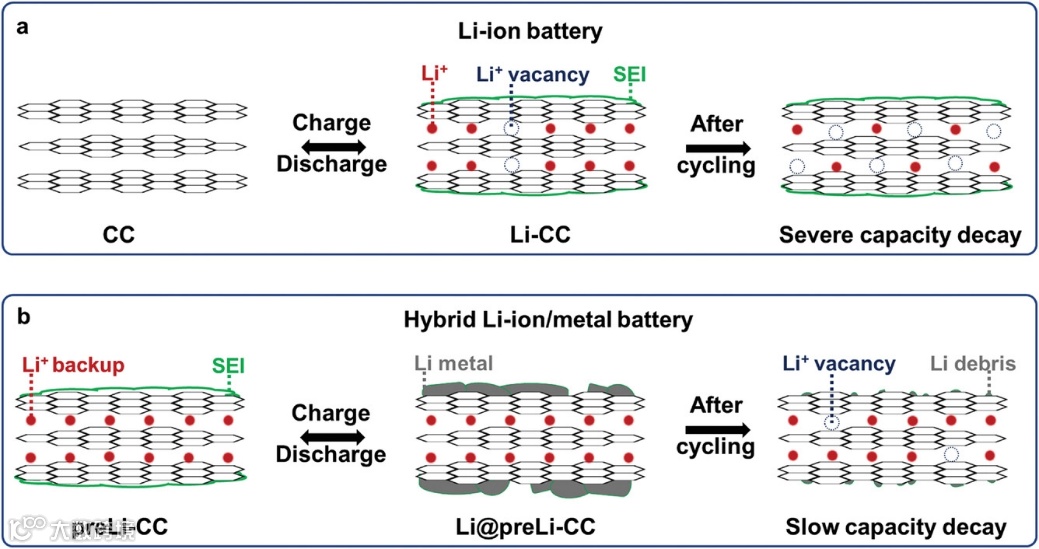 图1. a.传统锂离子电池循环后容量快速衰减;b.基于预锂化负极的混合锂离子/锂金属电池的机理