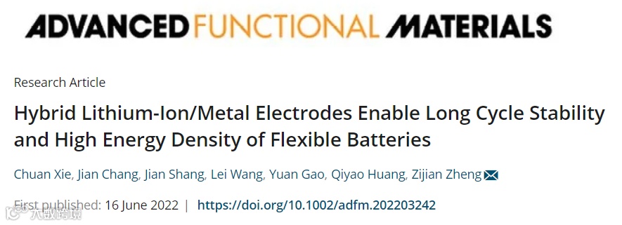 Xie, C., Chang, J., Shang, J., Wang, L., Gao, Y., Huang, Q., Zheng, Z. J., Hybrid Lithium-Ion/Metal Electrodes Enable Long Cycle Stability and High Energy Density of Flexible Batteries. Adv. Funct. Mater. 2022, 2203242.