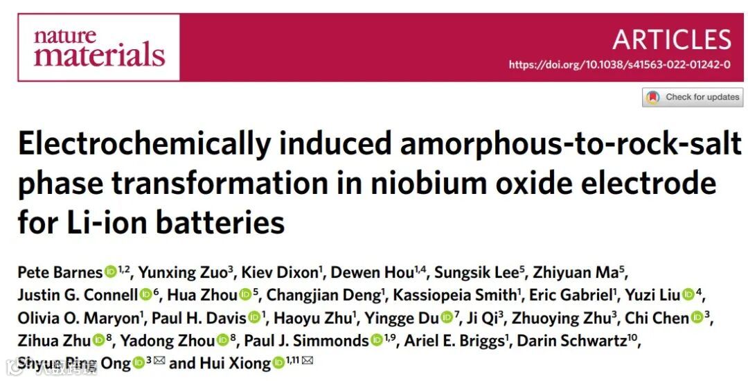 用于锂离子电池的氧化铌电极中电化学循环诱导的无定形到岩盐相变