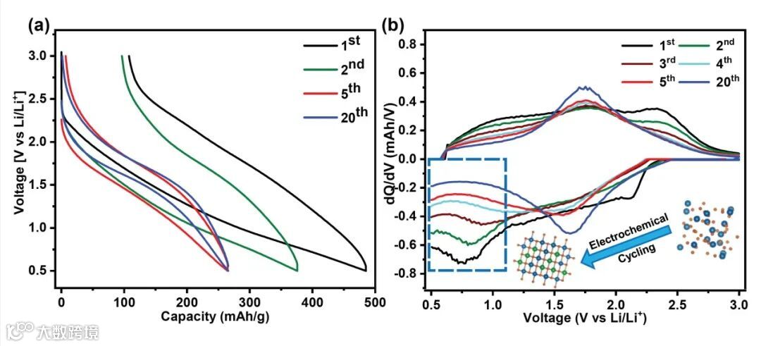 图1. 纳米通道五氧化二铌在不同循环下的电压分布图(a)及微分容量曲线 (b).