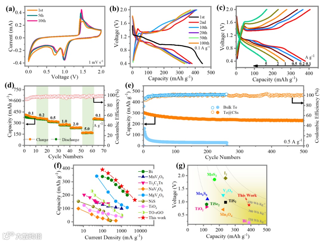 3. 该Mg-Te电池能量密度高达451 Wh Kg-1,循环性能优异(500次循环后容量保持率77.1%)。