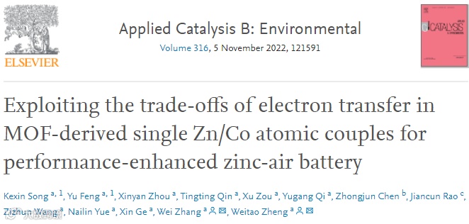 基于此,吉林大学的郑伟涛教授团队张伟教授在国际知名期刊Appl. Catal. B上发表题为“Exploiting the trade-offs of electron transfer in MOF-derived single Zn/Co atomic couples for performance-enhanced zinc-air battery”的研究论文。