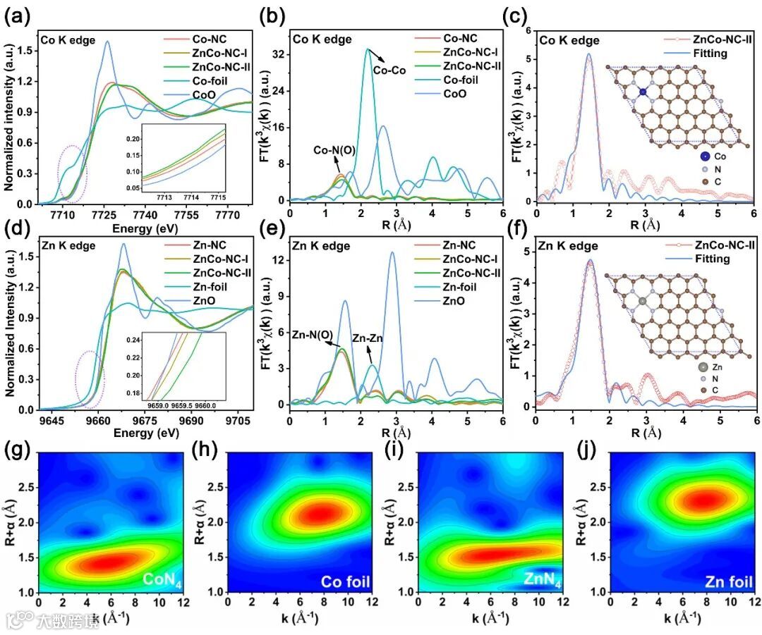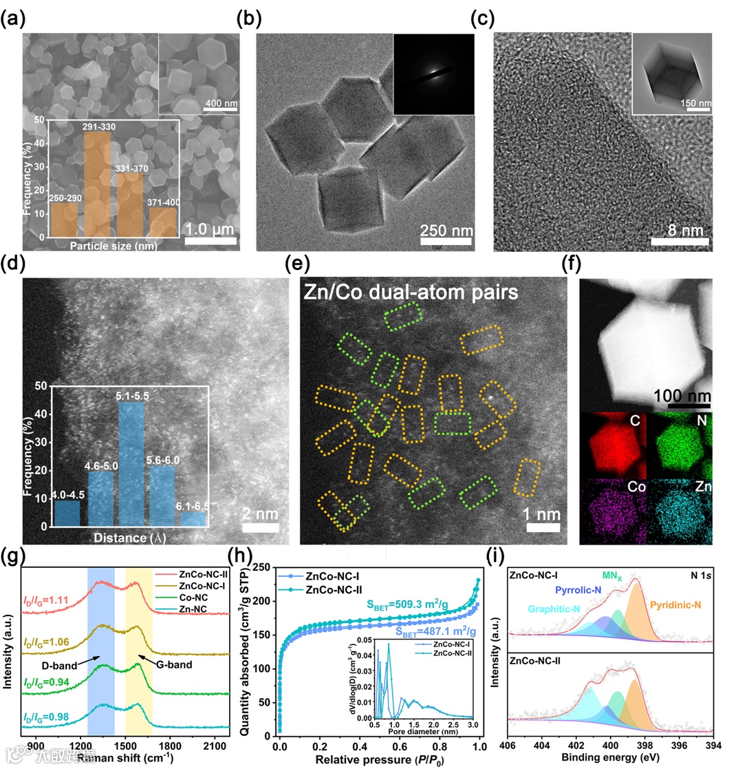 SEM和TEM图像证明了催化剂的外观呈现菱形十二面体结构,平均尺寸320nm。HRTEM图像中碳载体呈现出高度无序的非晶碳结构,没有发现金属相的存在。球差电镜对金属双原子的分布情况进行分析,统计结果证明了Zn/Co间的平均距离为5.3A。拉曼光谱表明双金属原子Zn/Co和氮掺杂破坏了sp2杂化结构的电荷分布和均匀自旋,导致ZnCo-NC-II表现出较高的ID/IG值。