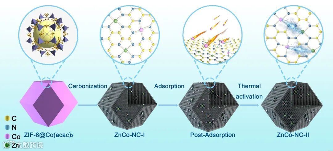 ZIF-8的空腔直径为11.6 Å,因此可以在ZIF前驱体合成过程中对乙酰丙酮钴分子(经DFT计算得出分子最大直径约为9.95 Å)进行原位封装,避免热解过程的Co原子发生聚集。经过碳化后的氮掺杂碳骨架具有丰富的微孔结构,利用后吸附策略吸附更多的金属钴离子,从而提高活性位点的密度,提高催化活性。