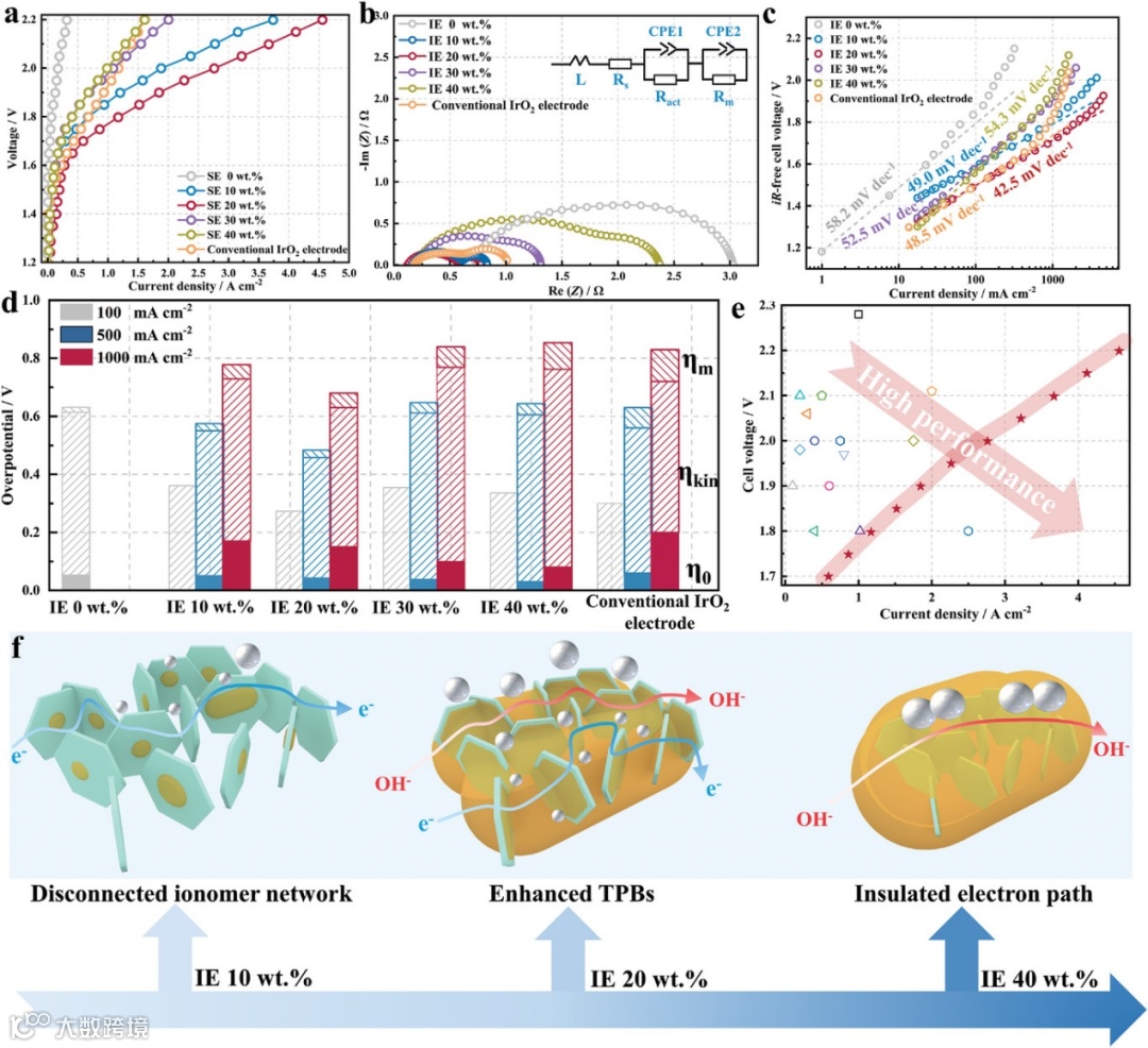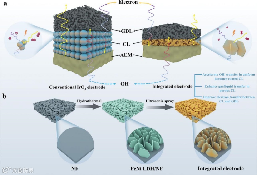 因此,高性能纯水阴离子交换膜电解水需要一种新的电极结构。与传的粉末催化剂相比,自支撑催化电极有许多优点,包括丰富的催化位点、增强电子转移能力,以及在高电流密度下的优异耐久性。据文献报道利用自支撑电极作为阳极氧析出催化层可实现优异的电解水性能。然而,由于自支撑电极不含碱性离聚物,导致催化层中缺少氢氧根离子的传递网络,难于在纯水条件下的阴离子交换膜电解水中应用。