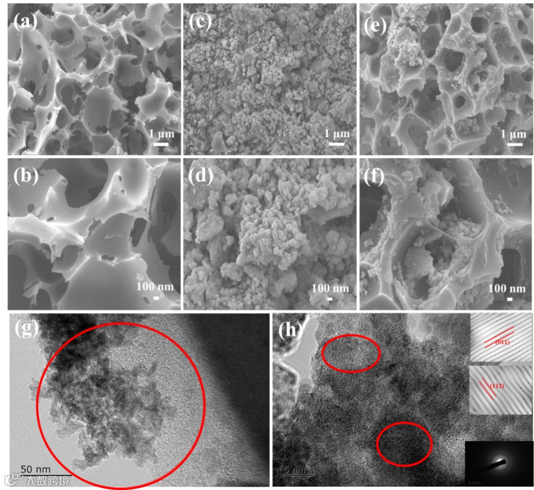 图2. 纯HPC的低倍(a)和高倍(b)SEM图像,纯Ni3Co1WO4的低倍(c)和高倍(d)SEM图像,Ni3Co1WO4的低倍(e)和高倍(f)SEM图像,(g-h)Ni3Co1WO4/HPC在不同放大倍率下的TEM图像