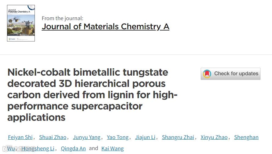 基于此,来自大连工业大学的安庆大教授、佟瑶副教授与中国科学院大连化物所王开副研究员合作,在国际知名期刊Journal of Materials Chemistry A上发表题为“Nickel-cobalt bimetallic tungstate decorated 3D hierarchical porous carbon derived from lignin for high-performance supercapacitor applications”的观点文章。
