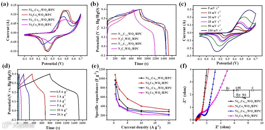 图4. 三电极系统中不同样品的(a)25 mV s-1的CV曲线,(b)0.5A g-1的GCD曲线;Ni3Co1WO4/HPC的(c)CV曲线和(d)GCD 曲线;不同样品的(e)倍率性能,(f)Nyquist图