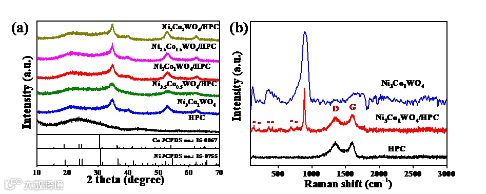 图1.(a)不同样品的XRD谱图,(b)纯Ni3Co1WO4、HPC和Ni3Co1WO4 /HPC复合材料的拉曼谱图