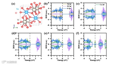图5. (a)NiWO4的晶体结构和计算的(b)NiWO4、(c)Ni3.5Co0.5WO4、(d)Ni3Co1WO4、(e)Ni2.5Co1.5WO4和(f)Ni2Co2WO4的部分态密度,费米能级设为0
