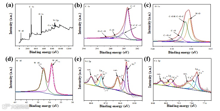 图3. Ni3Co1WO4/HPC (a) XPS 全谱,(b)C 1s,(c)O 1s,(d)W 4f,(e)Ni 2p,(f)Co 2p