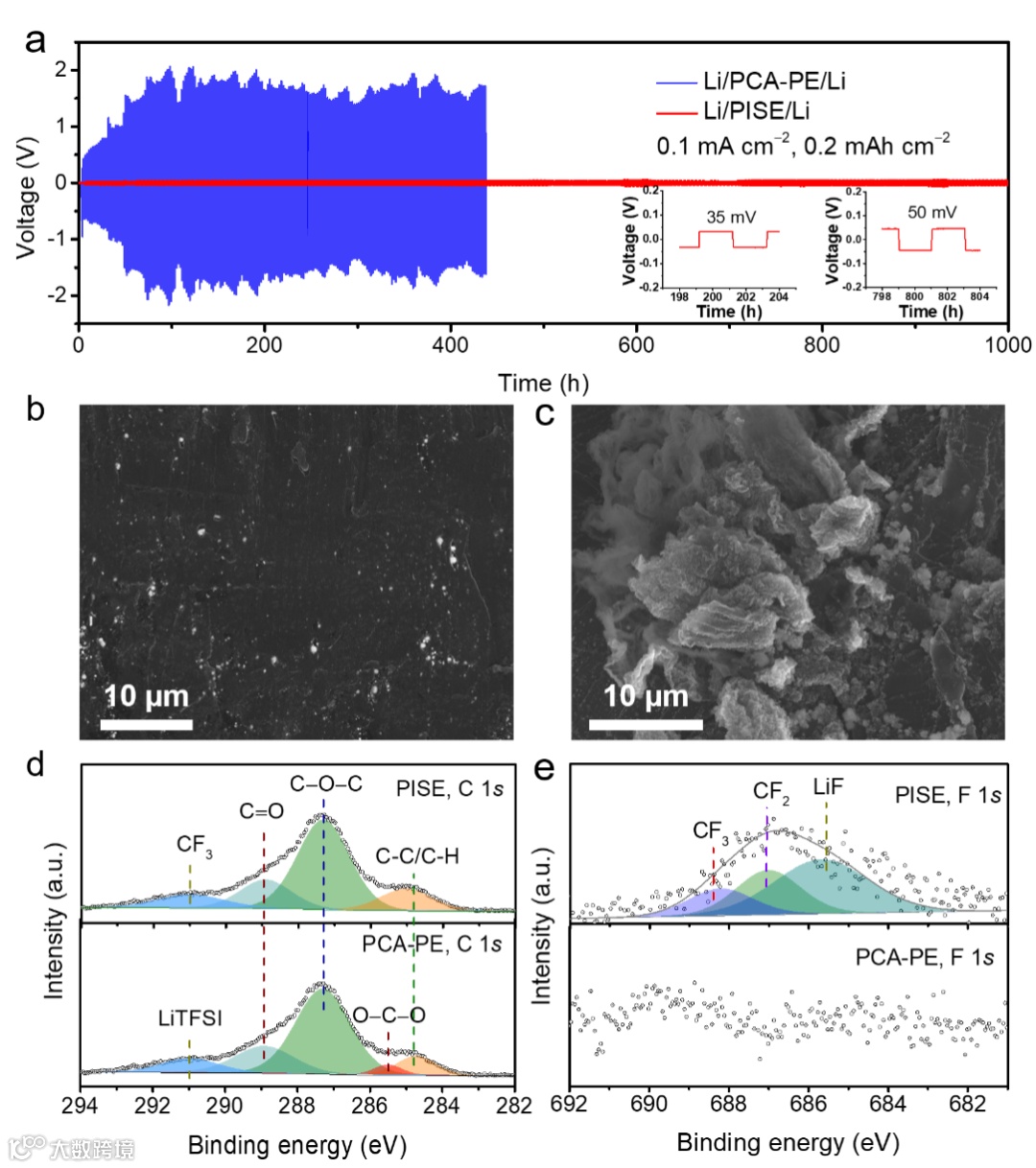 图3. PISE与锂金属负极的兼容性及循环后负极的表面和电解质界面表征