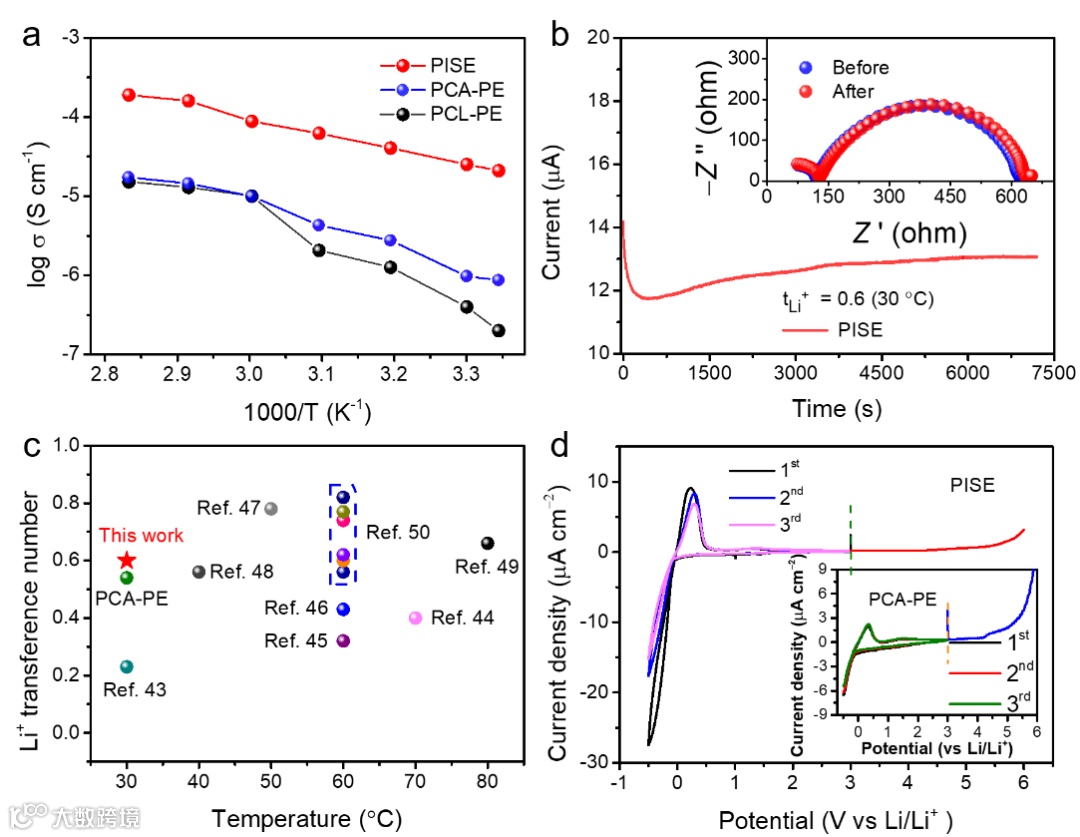 PISE具有高离子电导率(8.9 × 10−5 mS cm−1, 30 °C)和迁移数(0.6, 30 °C)及宽的电化学窗口(5.0 V, vs Li/Li+)。