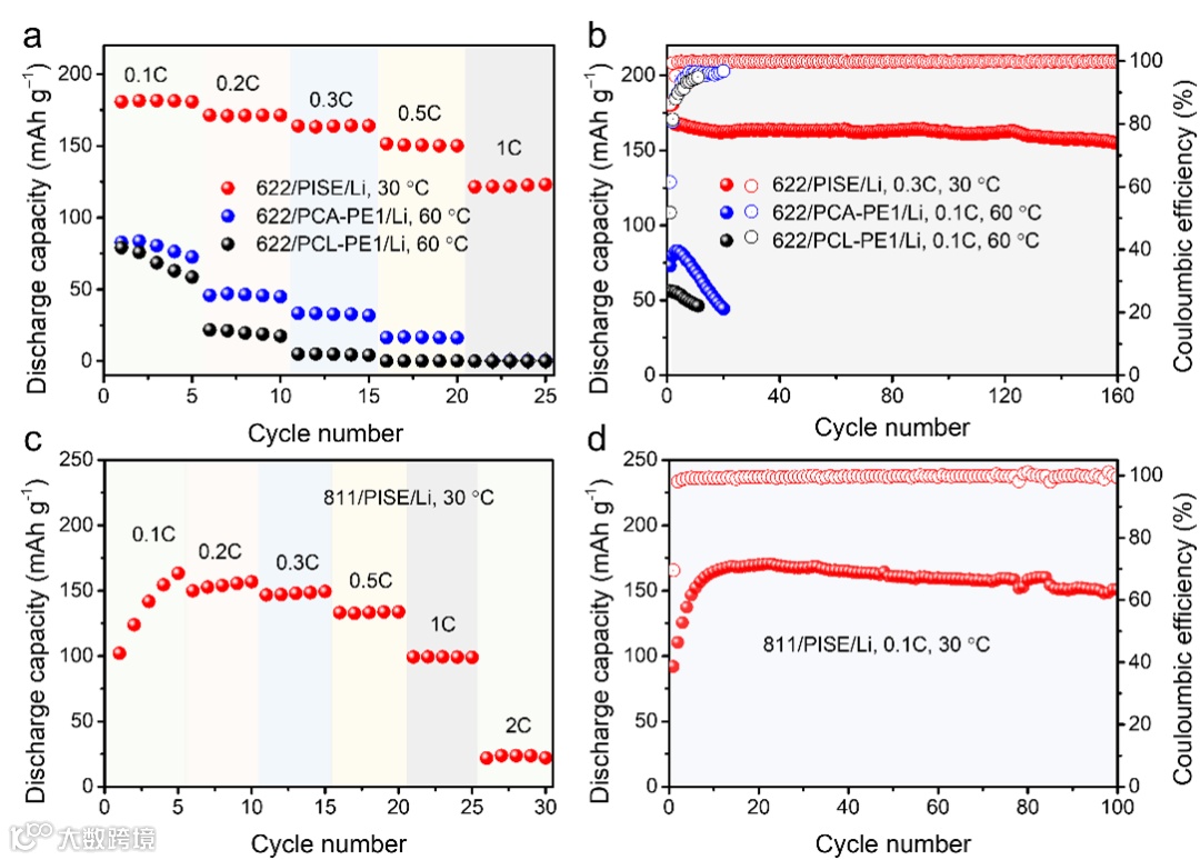 PISE基锂金属电池的倍率性能和循环性能明显优于PCA-PE1基电池,表明PISE电与高电压正极具有更好的兼容性。