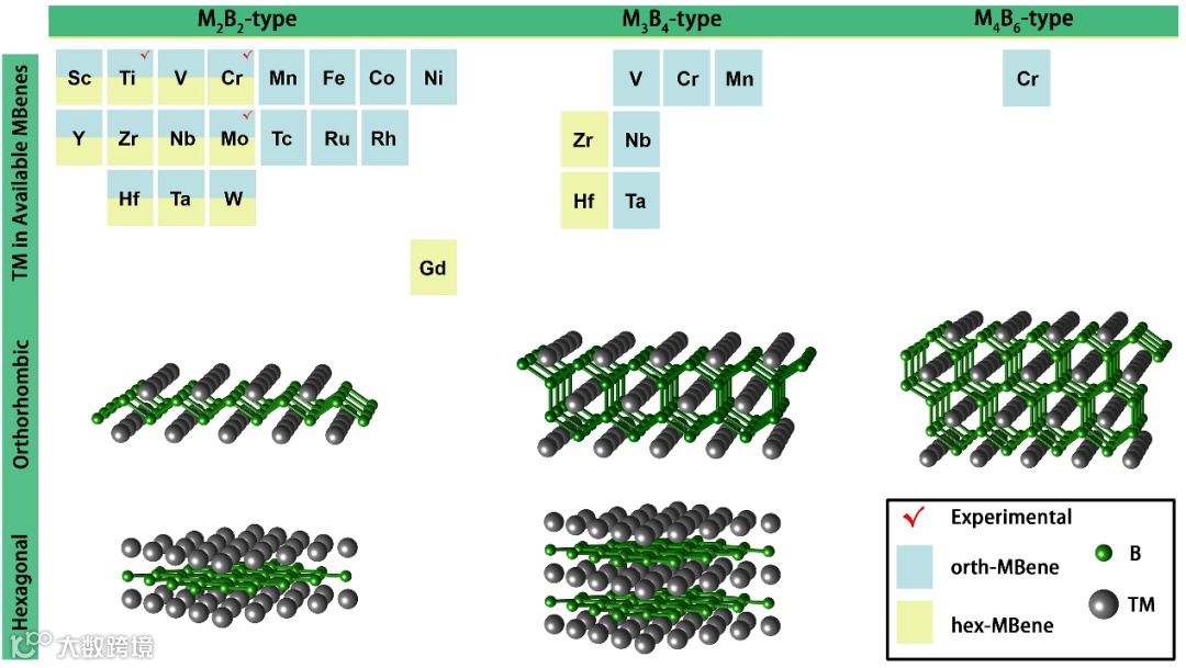 图1. 目前已报道的MBenes种类以及MBenes的原子结构示意图