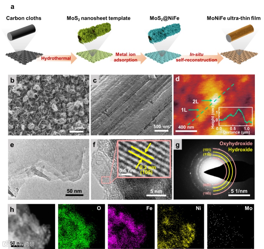 图1. a)MoNiFe(羟基)氢氧化物的制备过程。b)MoS2纳米片模板的SEM图。MoNiFe(羟基)氢氧化物的c)SEM图,d)AFM图,e-f)TEM图,g)SAED图,h)EDS图。
