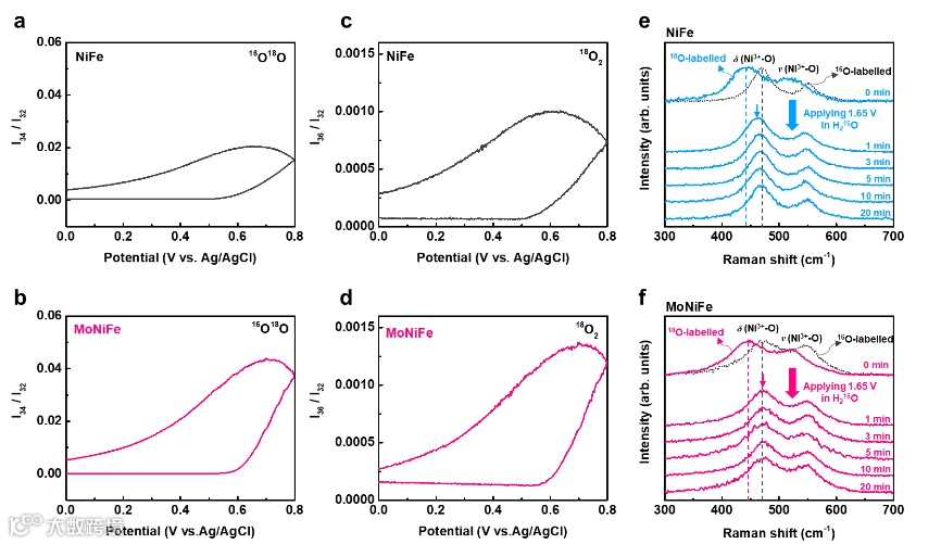 图3. NiFe和MoNiFe(羟基)氢氧化物的原位差分电化学质谱结果:a)NiFe的16O18O信号,b)MoNiFe的16O18O信号,c)NiFe的18O2信号,b)MoNiFe的18O2信号。18O标记的e)NiFe和f)MoNiFe(羟基)氢氧化物在16O电解液中反应的准原位拉曼光谱。