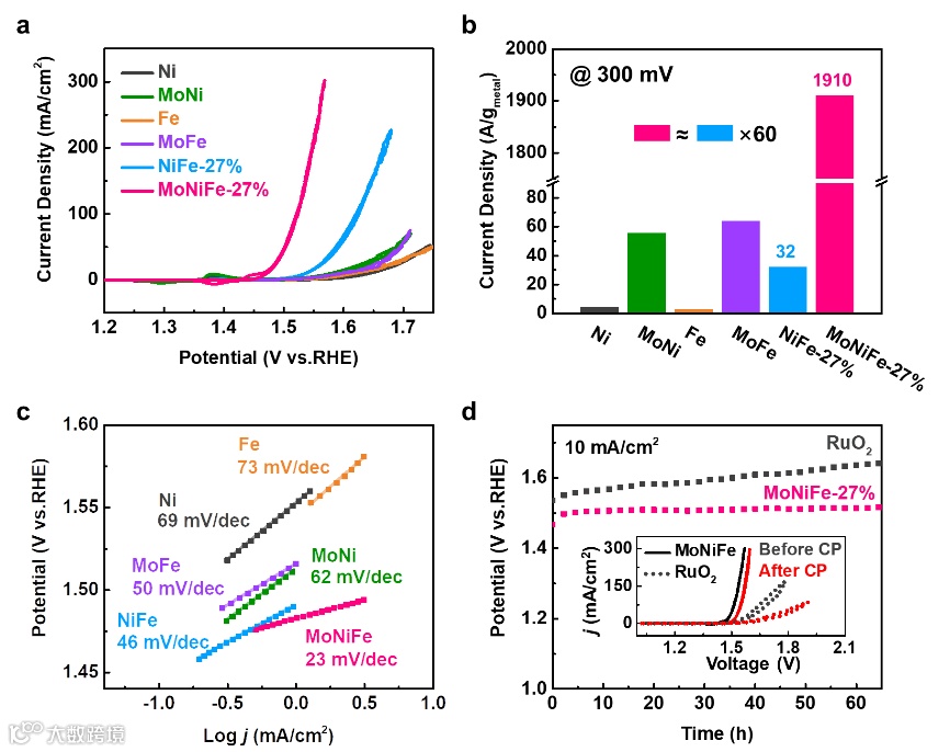 电化学测试结果表明,Mo掺杂能够有效提高NiFe(羟基)氢氧化物的OER本征活性,使得其质量活性提高了60倍。此外,在10 mA/cm2电流密度下,MoNiFe(羟基)氢氧化物表现出比商业催化剂RuO2更优异的稳定性。