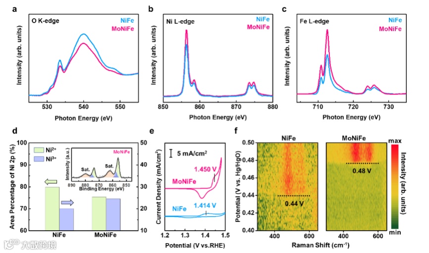 图6. a)O K-edge,b)Ni L-edge,c)Fe L-edge XAS光谱。d)NiFe(羟基)氢氧化物和MoNiFe(羟基)氢氧化物中Ni价态比较。e)氧化还原峰比较。f)原位拉曼光谱。