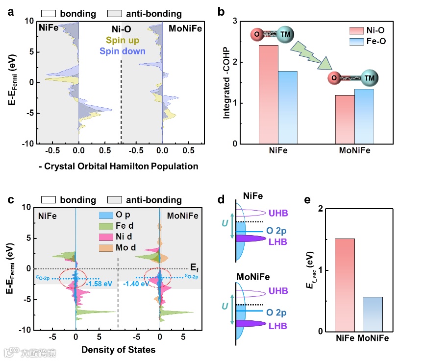 进一步的DFT计算结果表明,Mo掺杂后金属-氧键变弱,且O 2p能带中心发生向费米能级方向发生移动。因此,MoNiFe(羟基)氢氧化物表现出更低的氧空位形成能,有利于促进晶格氧的活性。