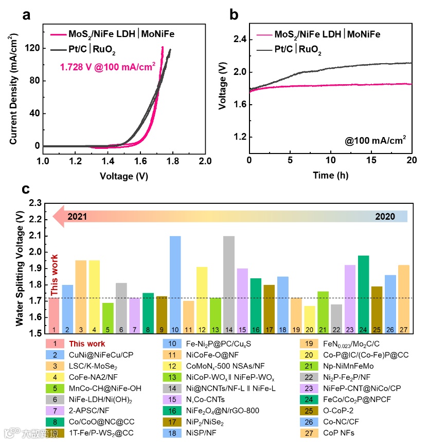 图7. a)全电解水裂解性能。b)在100 mA/cm2下电解水的计时电位曲线。c)在100 mA/cm2下电解电压比较。