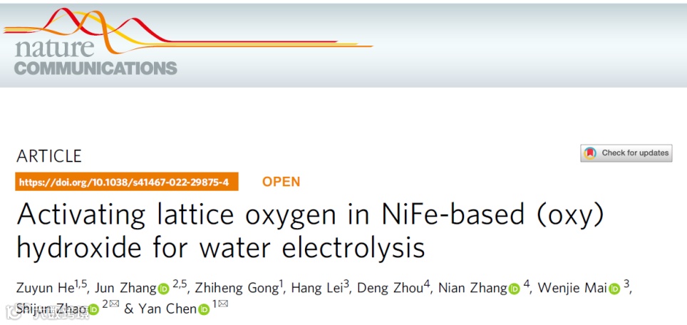 最近,华南理工大学陈燕教授团队和香港城市大学赵仕俊博士团队通过Mo掺杂对NiFe(羟基)氢氧化物的晶格氧活性进行调节,系统地研究了晶格氧活性对氧析出反应活性的影响。相关研究成果以“Activating lattice oxygen in NiFe-based (oxy)hydroxide for water electrolysis”为题发表在Nature Communications。