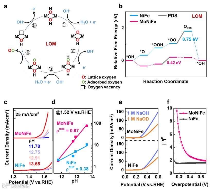 图4. a)LOM机制示意图。b)反应能垒图。c)不同pH调节下的LSV曲线。d)OER活性对pH的依赖程度。e)NaOH和NaOD电解液中的LSV曲线比较。f)动力学同位素效应比较。
