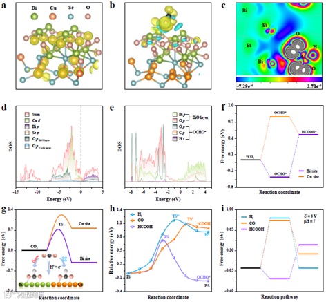 理论计算显示[Cu2Se2]2-层转变为Cu-Se-O后仍然保持良好的导电功能,[Bi2O2]2+层中Bi p轨道与OCHO*中的O p轨道重叠,新型的Bi-O配位对OCHO*中间体具有很强的活化和稳定能力。因此,相比HER和 CO的中间体,在BiCuSeO超晶格上形成甲酸中间体OCHO*具有更低的热力学和动力学自由能, BiCuSeO纳米片具有高效转化CO2制甲酸的活性。