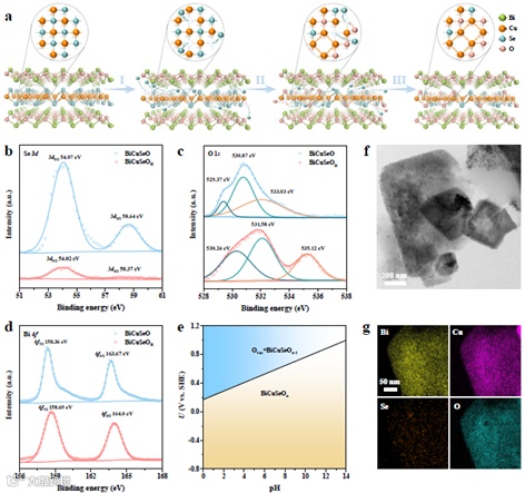 图5. 二氧化碳还原前后BiCuSeO结构演变、XPS、TEM和EDS