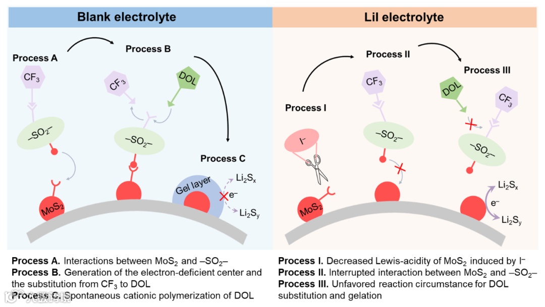 本工作首次发现锂硫电池中常用的锂盐双三氟甲磺酸亚胺锂(LiTFSI)会加剧二硫化钼(MoS2)电催化剂的表面凝胶化现象。具体而言,表面凝胶化的产生源于MoS2和LiTFSI相互作用后产生的强路易斯酸性位点所引发的1,3-二氧戊环(DOL)阳离子开环聚合。由于表面凝胶化极大阻碍了电催化剂的性能发挥,因而基于路易斯酸碱理论引入具有路易斯碱性的锂盐碘化锂(LiI)以阻断LiTFSI和MoS2的相互作用,进而抑制表面凝胶化、充分发挥催化剂的性能。