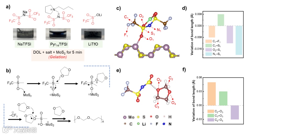 基于谱学、电子显微学测试与密度泛函理论计算等结果,表面凝胶化的产生源于MoS2和LiTFSI相互作用后产生的强路易斯酸性位点引发的DOL阳离子开环聚合。具体而言, MoS2的路易斯酸位点与LiTFSI中的三氟甲磺酰基团(CF3SO2‒)中的氧原子发生作用,诱发三氟甲基阴离子(CF3−)的离去并产生具有更强路易斯酸性的缺电子位点,进而诱发DOL溶剂的阳离子开环聚合。