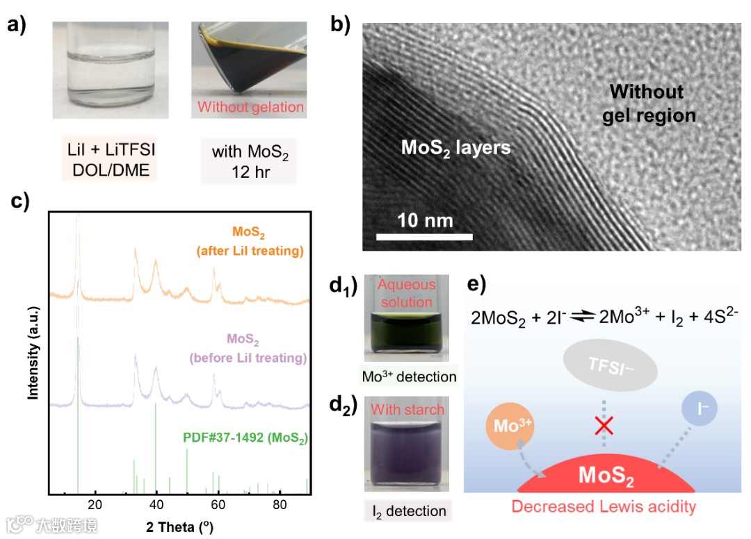 为了打破LiTFSI和MoS2之间的相互作用,具有路易斯碱性的锂盐LiI作为添加剂引入到电解液之中可有效避免表面凝胶化。具体而言,LiI和MoS2可发生微量氧化还原反应以降低MoS2的路易斯酸性。同时LiI的存在使得LiTFSI难以与MoS2发生相互作用,因而从源头上解决了电催化剂表面凝胶化的问题。