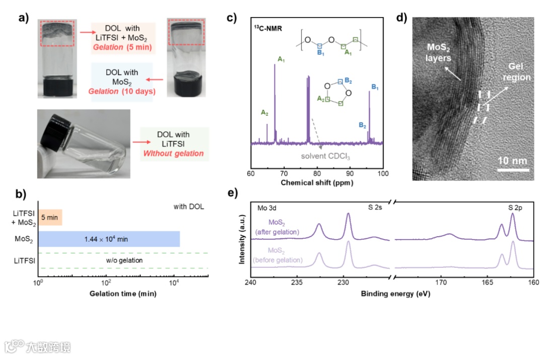 本文以MoS2为电催化剂、DOL为溶剂、LiTFSI为锂盐作为模型体系进行研究,发现电催化剂和锂盐、溶剂均会发生强相互作用,进而产生电催化剂的表面凝胶化现象,该现象极大程度上损害了电催化剂的催化活性,使得其催化硫物种转化能力下降。