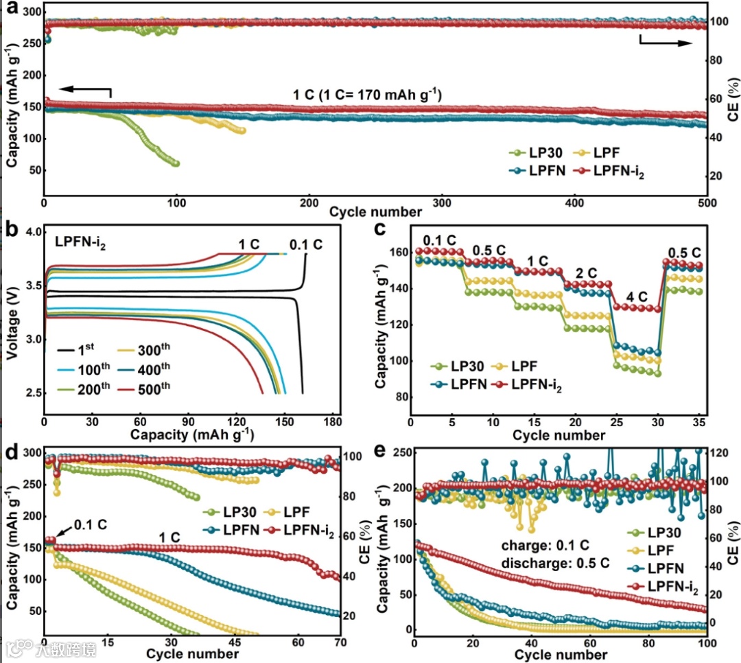 该观点文章介绍了一种合适的硝酸锂增溶剂,并提出硝酸锂“高浓添加剂”,同时创新性的将I-/I3-氧化还原对与高浓添加剂结合,共同加入商业化碳酸酯电解液中,一方面硝酸锂“高浓添加剂”在本体电解液中能够保持阴阳离子聚集结构,促进生成富含Li3N的SEI,另一方面I-/I3-氧化还原对能够起到类似化学抛光的作用并自发的将SEI中的非活性锂回收到脱锂正极中,从而使得改性后的碳酸酯电解液能够有效的提高金属锂电池库伦效率以及大大减缓电池容量衰减的速率。