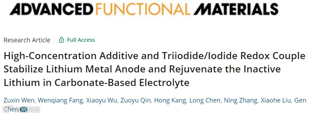 基于此,来自中南大学的陈根副教授在国际知名期刊Advanced Functional Materials上发表题为“High-Concentration Additive and Triiodide/Iodide Redox Couple Stabilize Lithium Metal Anode and Rejuvenate the Inactive Lithium in Carbonate-Based Electrolyte”的文章。