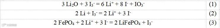 同时密度泛函理论(DFT)计算表明I3-和Li2O之间的反应可以自发进行(∆E0 kJ mol-1),可以看出I-/I3-氧化还原对可以选择性的清除不利成分(Li2O),保留SEI中有利成分 (LiF, Li3N)。此外,I-/I3-氧化还原对将非活性锂重新转化成活性锂存储在脱锂正极中也是一个热力学可行的快速自发反应。