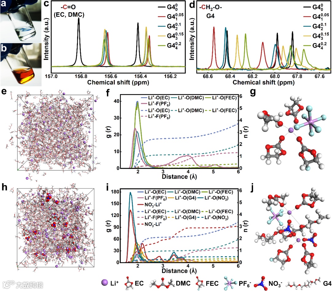 该工作中作者选用了锂兼容的四乙二醇二甲醚(G4)作为硝酸锂增溶剂,得益于其合适的DN(远远大于碳酸酯溶剂但小于硝酸根)以及丰富的溶剂化位点(O原子),使其具有远超常见醚类溶剂(DME,DOL)的溶解度(~ 4-5 M),同时避免了G4恶化金属锂表面SEI的缺点。