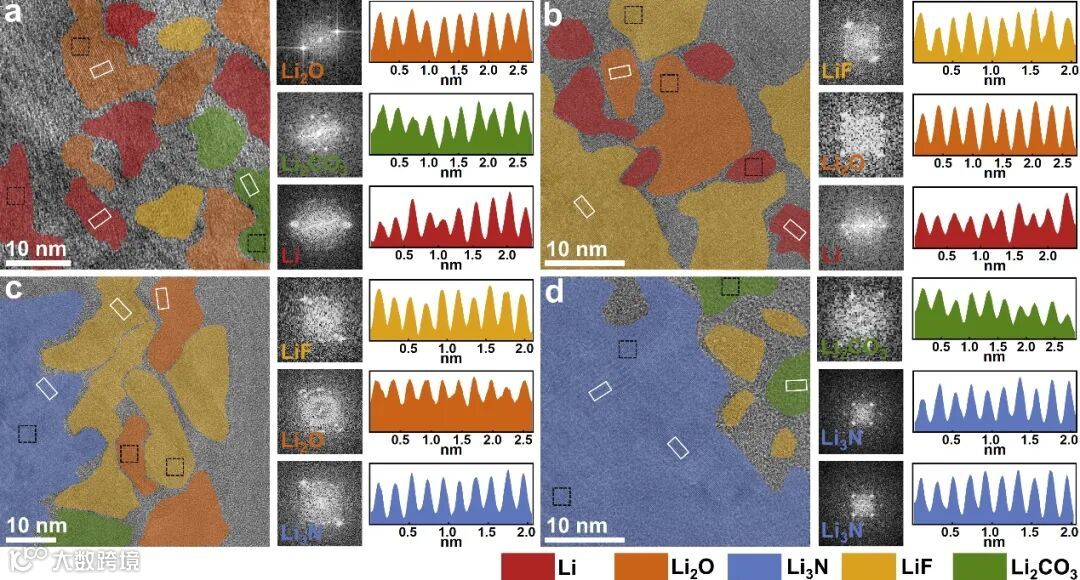 图2.cryo-TEM 成像下不同电解质中产生的SEI结构与成分