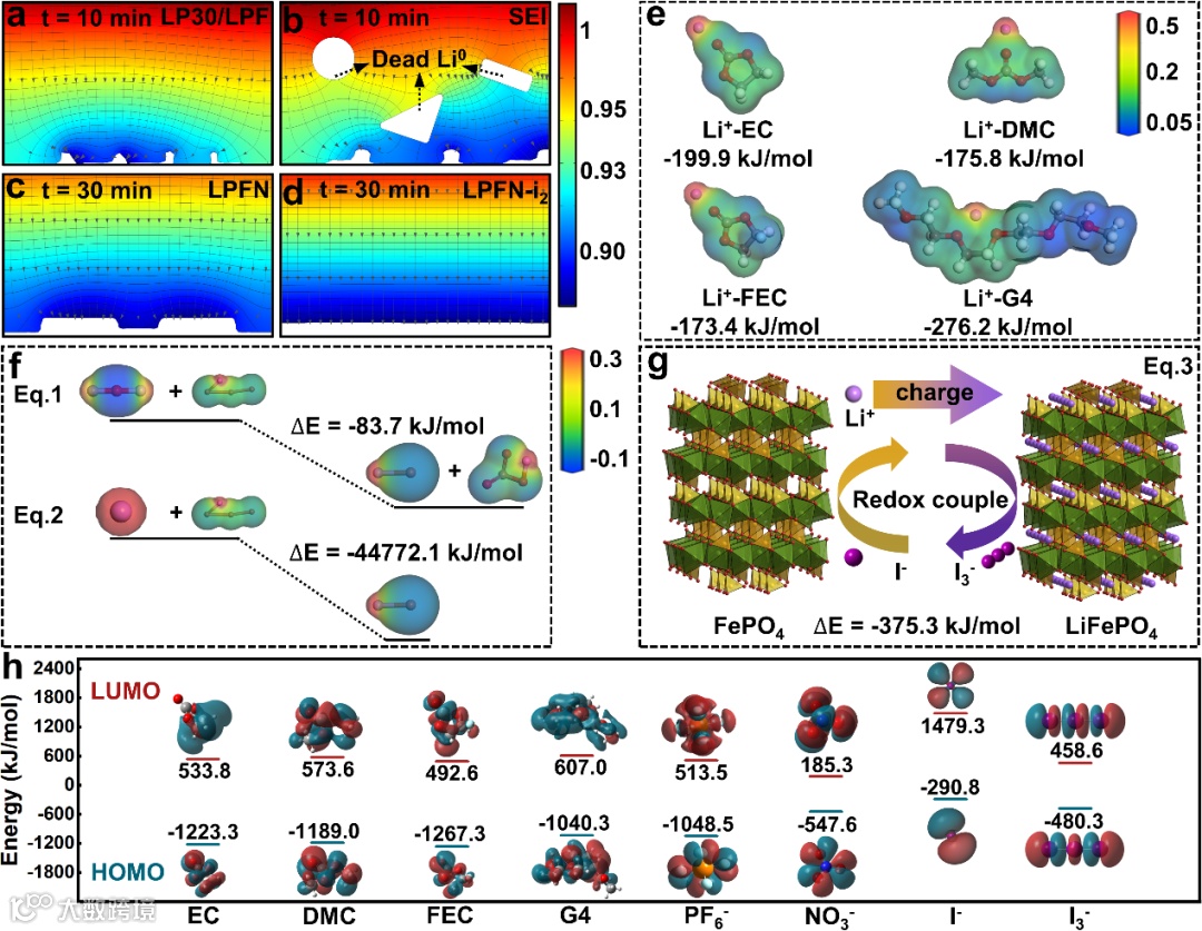 物理场模拟表明高离子电导率的Li3N有利于锂离子的快速输运,促进锂的横向生长。死锂的存在会导致不均匀的锂离子通量并最终导致枝晶生长。由于I-/I3-氧化还原对对死锂的清除,保证了SEI的成分大部分为高离子导率的Li3N,实现更均匀的锂离子通量和浓度梯度分布,导致设计电解液中的紧密块状锂沉积。