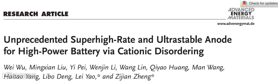 基于此,来自深圳大学的姚蕾助理教授和香港理工大学的郑子健教授合作,在国际知名期刊ADVANCED ENERGY MATERIALS 上发表题为“Unprecedented Superhigh-Rate and Ultrastable Anode for High-Power Battery via Cationic Disordering”的观点文章。