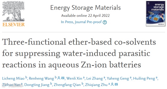 在这里,来自湖南大学的朱智强教授与深圳大学的王任衡合作,在国际知名期刊Energy Storage Materials上发表题为“Three-functional ether-based co-solvents for suppressing water-induced parasitic reactions in aqueous Zn-ion batteries”的研究论文。