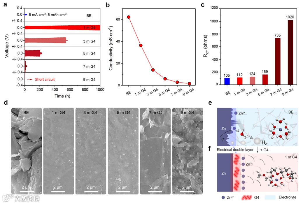研究发现,随着G4浓度的增大,其离子电导率显著降低。这会导致界面阻抗增大,并引起锌枝晶的生成,不利于锌负极的稳定循环。结果表明,1 m G4具有最好的电化学性能,其在5 mA cm-2 和 5 mAh cm-2的条件下可稳定循环1000小时。