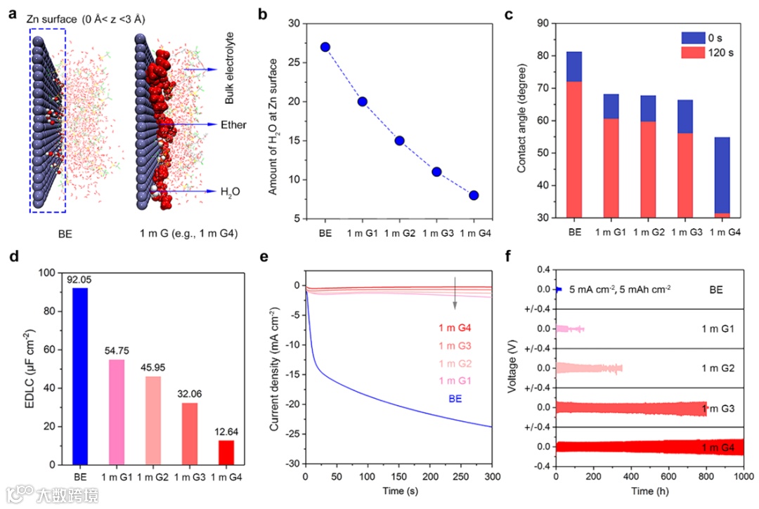 通过理论计算和实验表征研究了四种醚/水混合电解液中锌负极的界面性质。结果表明醚类溶剂可以优先吸附在锌负极表面,从而减少水分子在锌负极界面的吸附,降低水在锌负极分解的可能。此外,随着醚类分子中醚氧键的增多,其吸附能力越强,锌负极界面的水分子越少。基于以上原因,G4理论上具有最好的抑制效果,从而实现锌负极的长时间循环。
