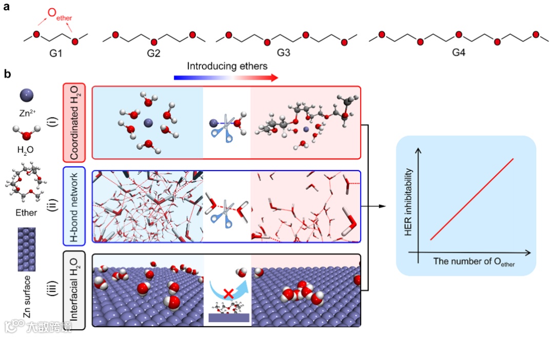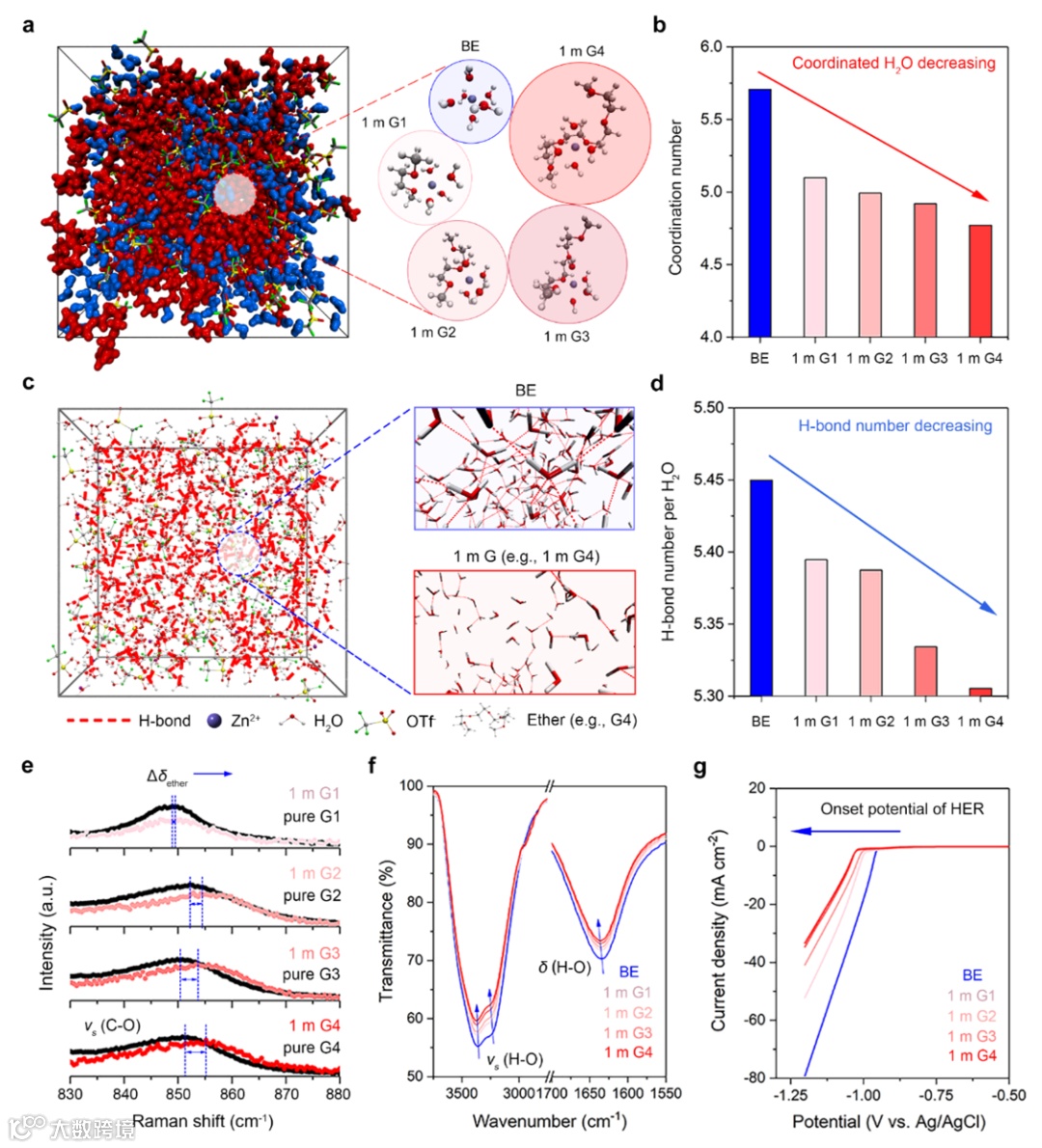 结果表明,醚类溶剂的加入不仅可以减少锌离子第一壳层结构中结合水的数目,还可以打破自由水的氢键网络,从而降低电解液的活性,抑制析氢副反应的发生。此外,这种抑制效果随着醚类分子中醚氧键的增多显著增强。