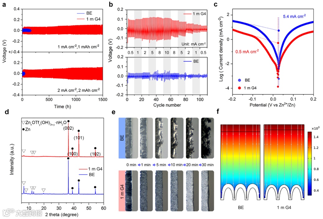 通过系统对比纯水电解液以及1m G4电解液中的锌沉积行为,发现G4的引入可以有效抑制水诱导寄生反应以及锌枝晶的生长,从而大幅延长锌负极的循环寿命。