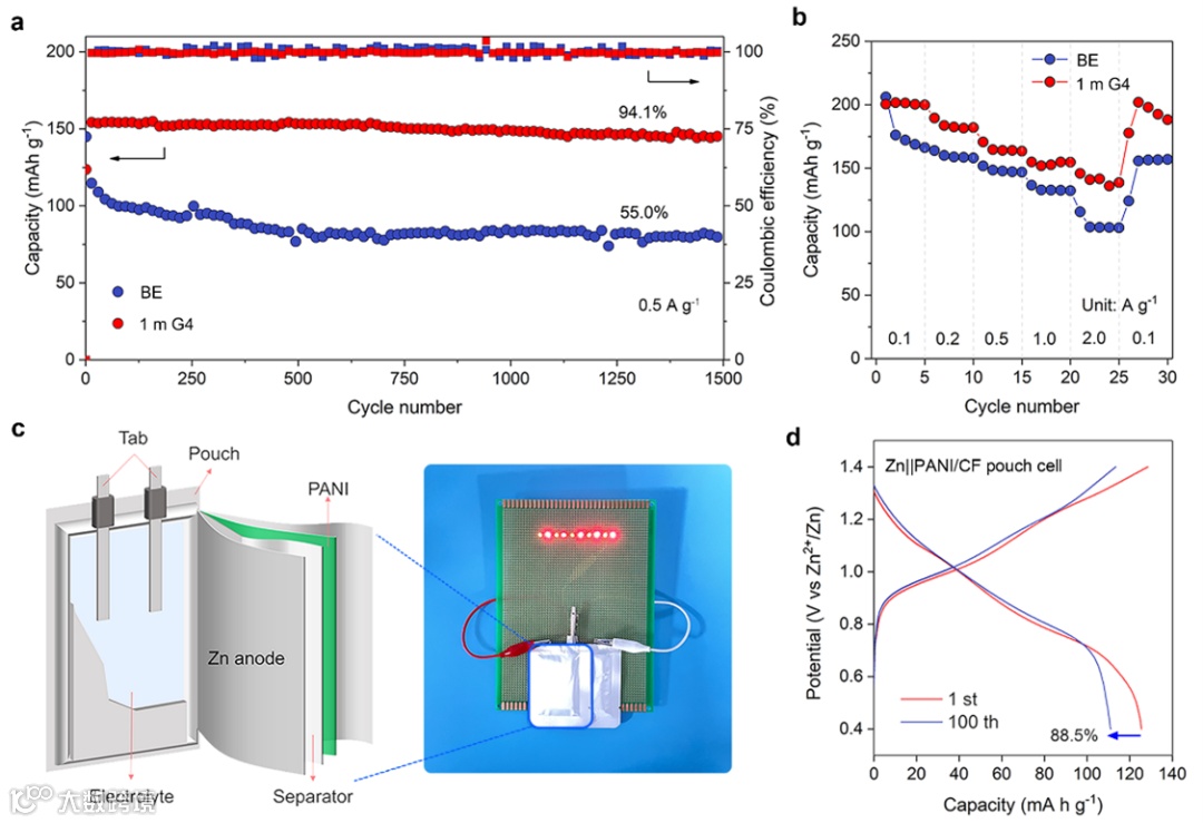通过组装Zn||PANI/CF全电池验证了1m G4的实用性。研究表明,1m G4可以提升全电池的循环寿命和倍率性能。在0.5 A g-1的电流密度下循环1500周后,电池容量保持率高达94.1%。此外,组装的软包电池也取得了满意的循环性能。